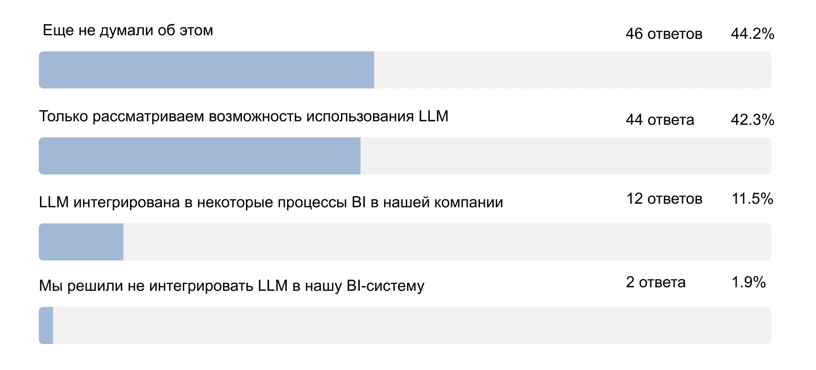 Среди 87% профессионалов приблизительно одна половина утверждает, что не думали о внедрении LLM в BI-систему их компаний; другая - только рассматривают возможности LLM.