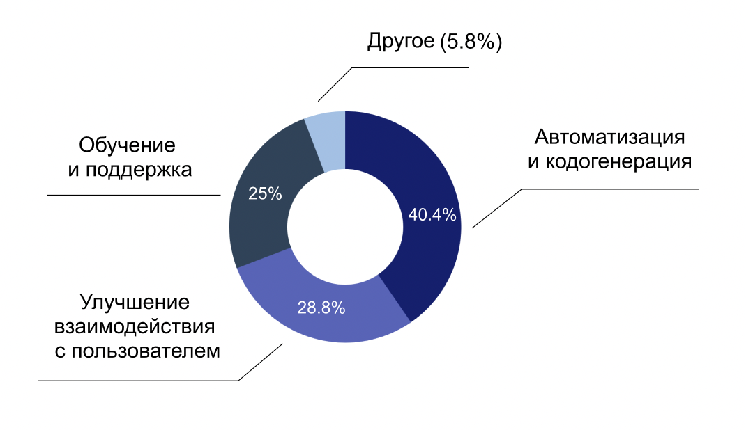 Улучшение взаимодействия с пользователем и обучение и поддержка разделяют второе и третье место по популярности по мнению специалистов. Около 6% ответили, что видят потенциал Generative AI во всех сферах.